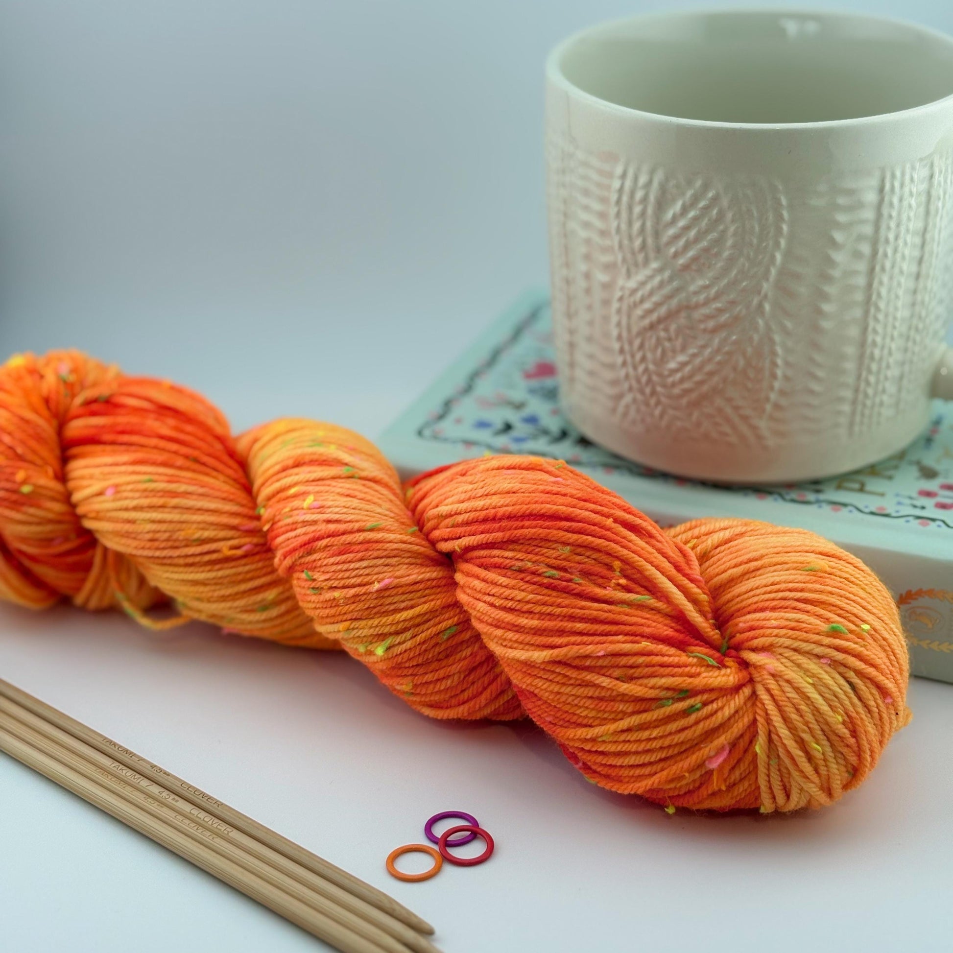 Yarn is dyed in the Safety Orange colorway; tonal shades of neon orange.