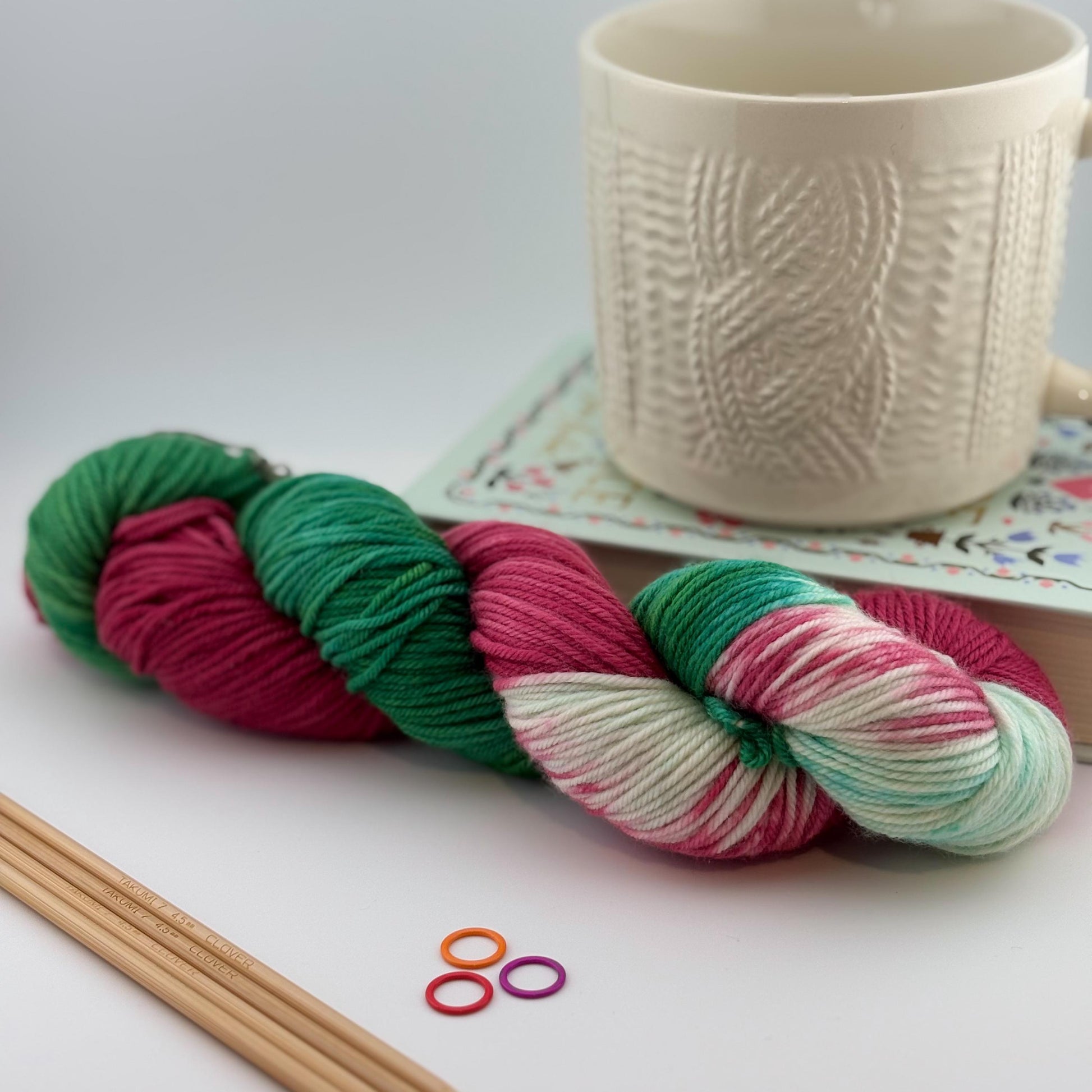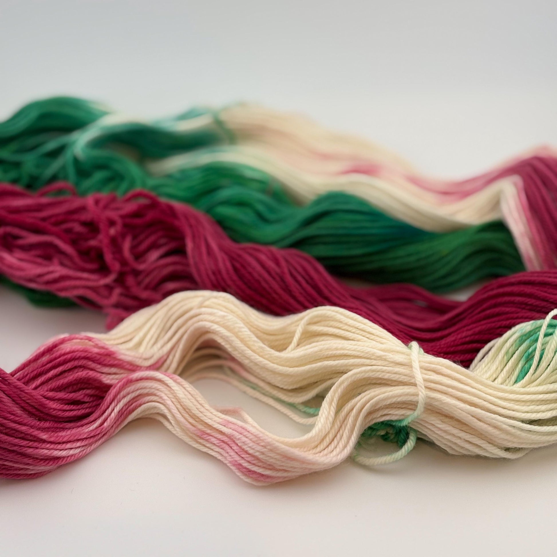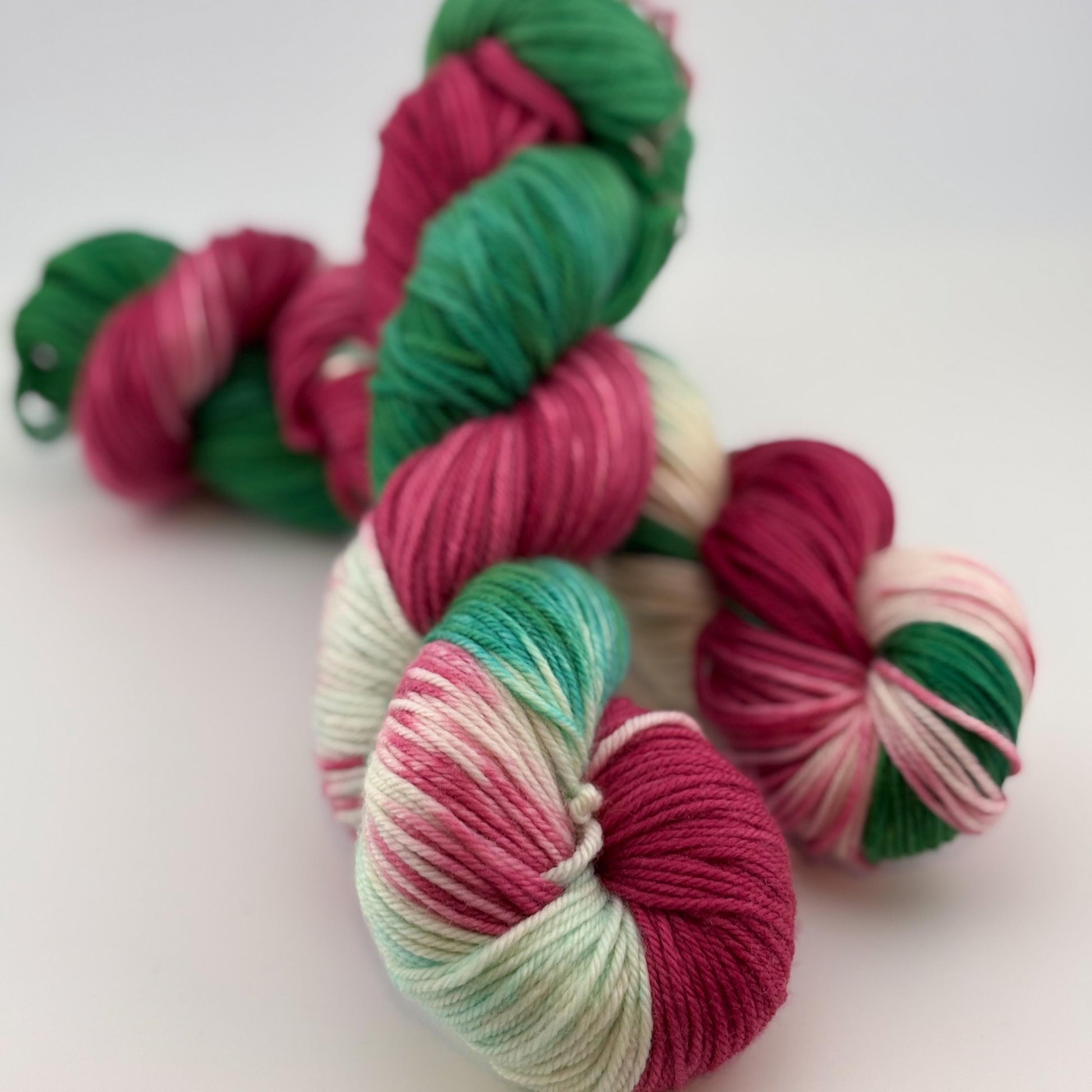 Hand dyed, superwash, dk weight yarn. 231 yards/100 grams. 80% superwash merino wool, 10% cashmere, 10% nylon. Yarn is dyed in the Old FashionedChristmas colorway; tonal shades of green, and berry.
