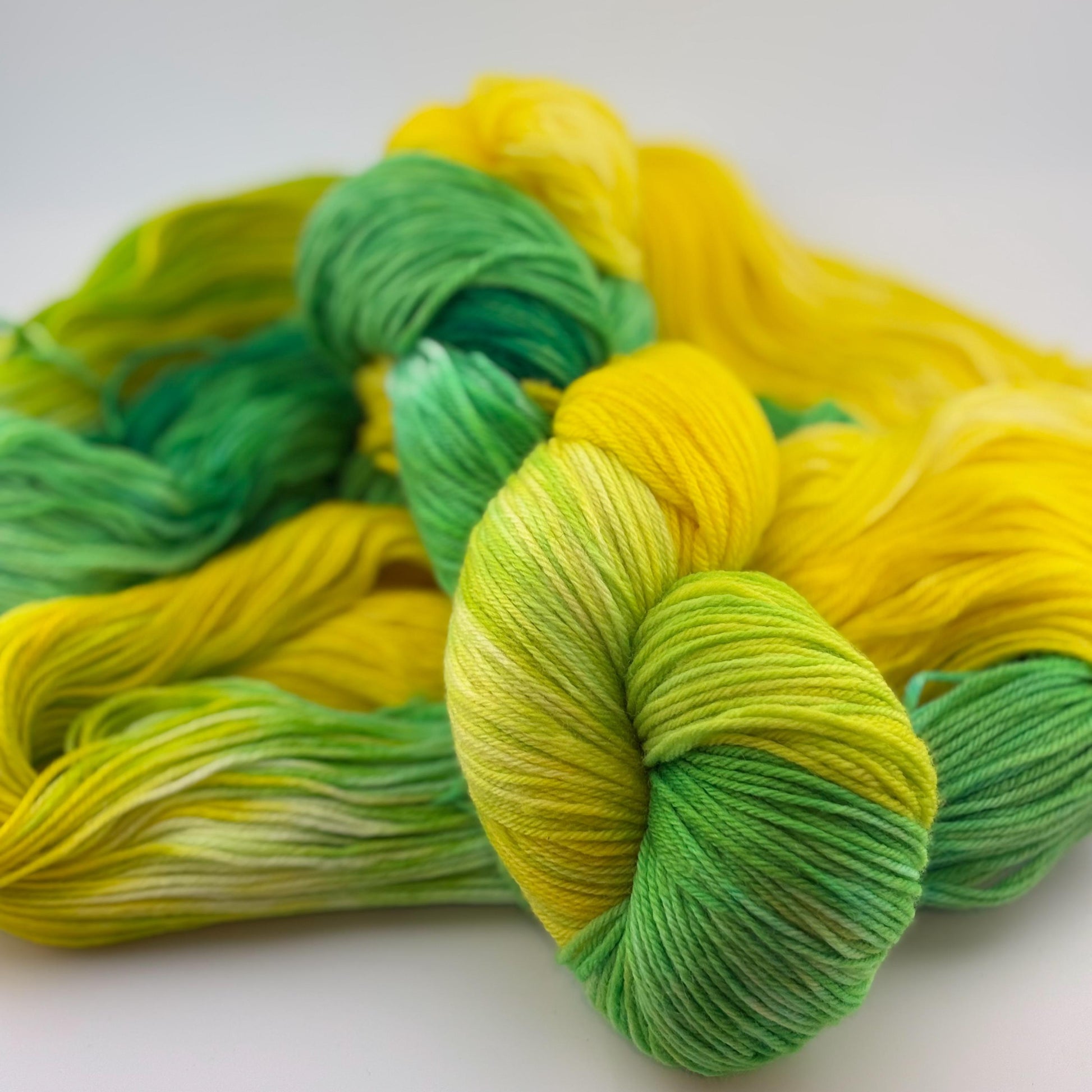 Hand dyed, superwash, sock/fingering weight yarn. 435 yards/100 grams. 80% superwash merino wool, 10% cashmere, 10% nylon. Yarn is dyed in the lemon lime colorway; tonal shades of green and yellow. This colorway is inspired by spring but also happens to be oregon duck colors.