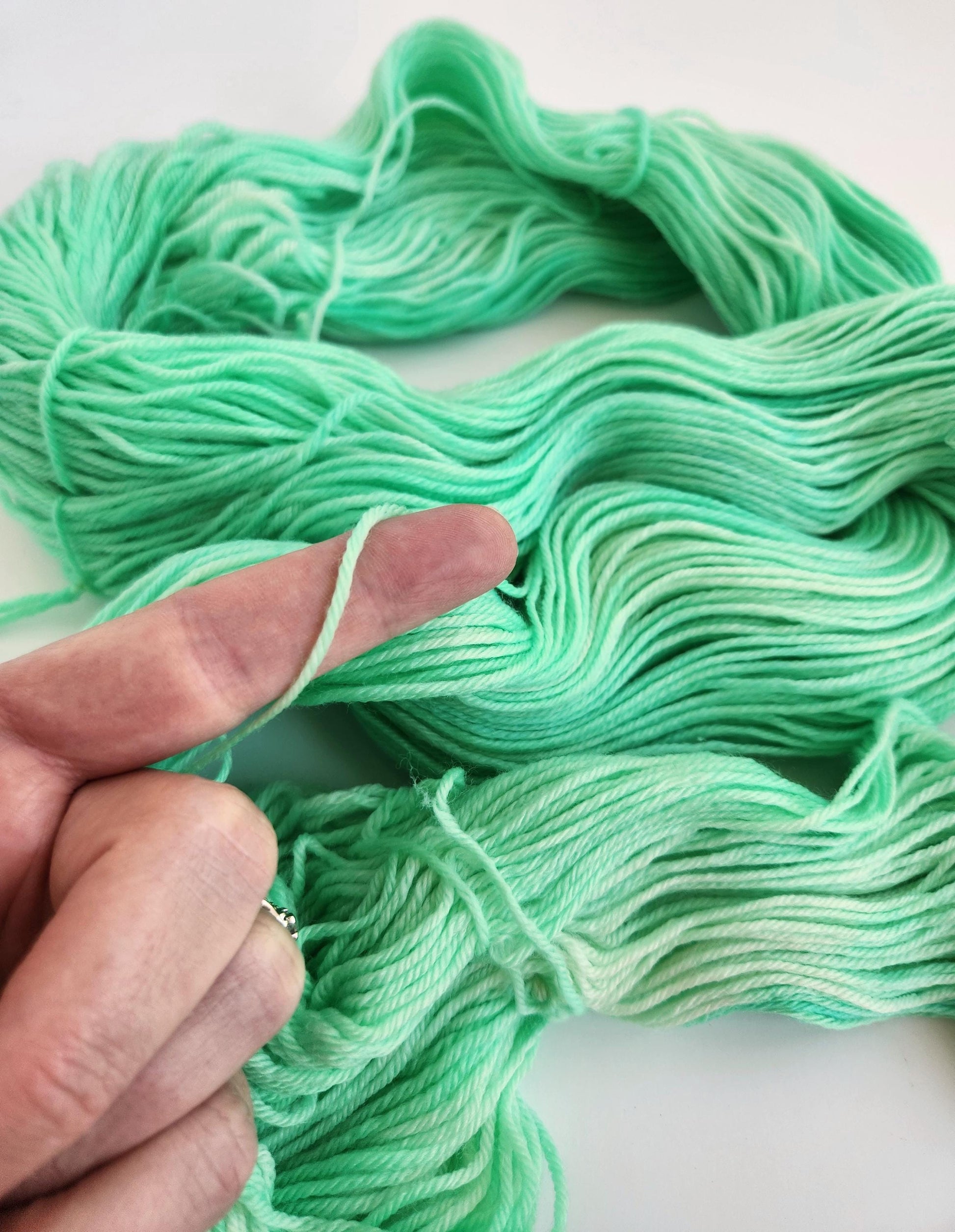 Hand dyed, superwash, sock/fingering weight yarn. 435 yards/100 grams. 80% superwash merino wool, 10% cashmere, 10% nylon. Yarn is dyed in the spring green colorway; tonal shades of light green.